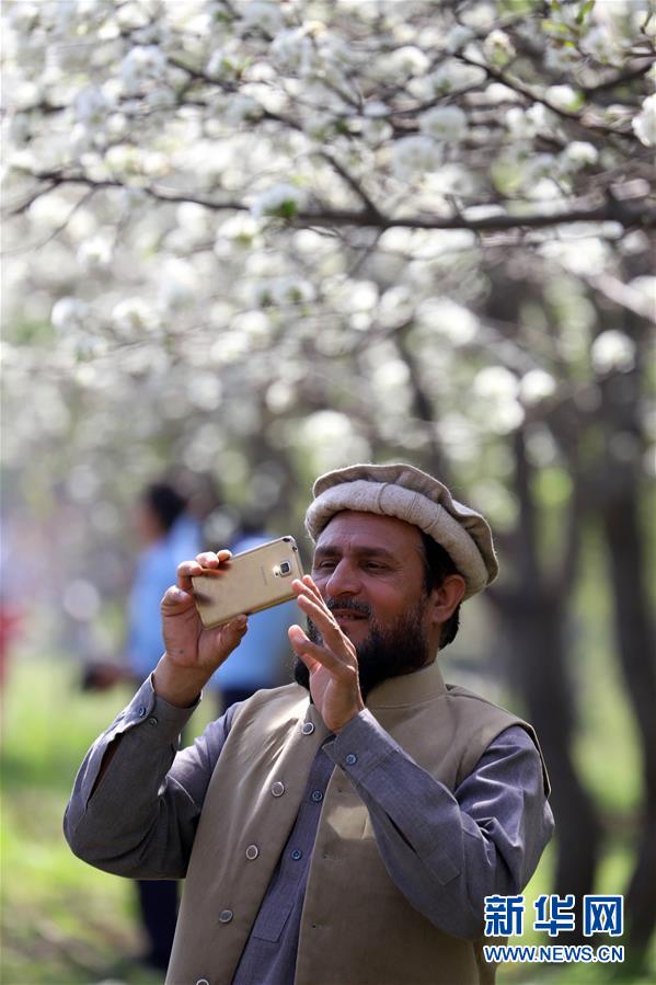 2019年3月21日,一名男子在巴基斯坦伊斯兰堡拍摄盛开的花朵。 新华社发(艾哈迈德·卡迈勒摄)