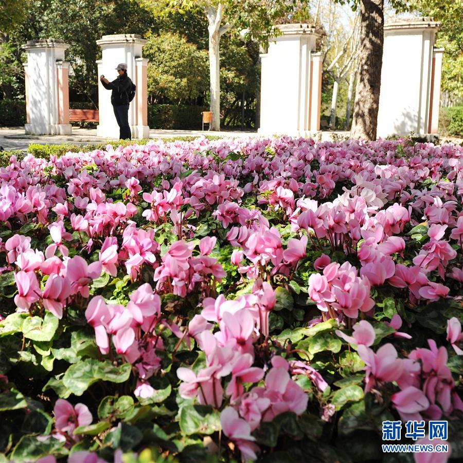 3月30日,市民在西班牙马德里一处公园欣赏鲜花。 新华社记者郭求达摄