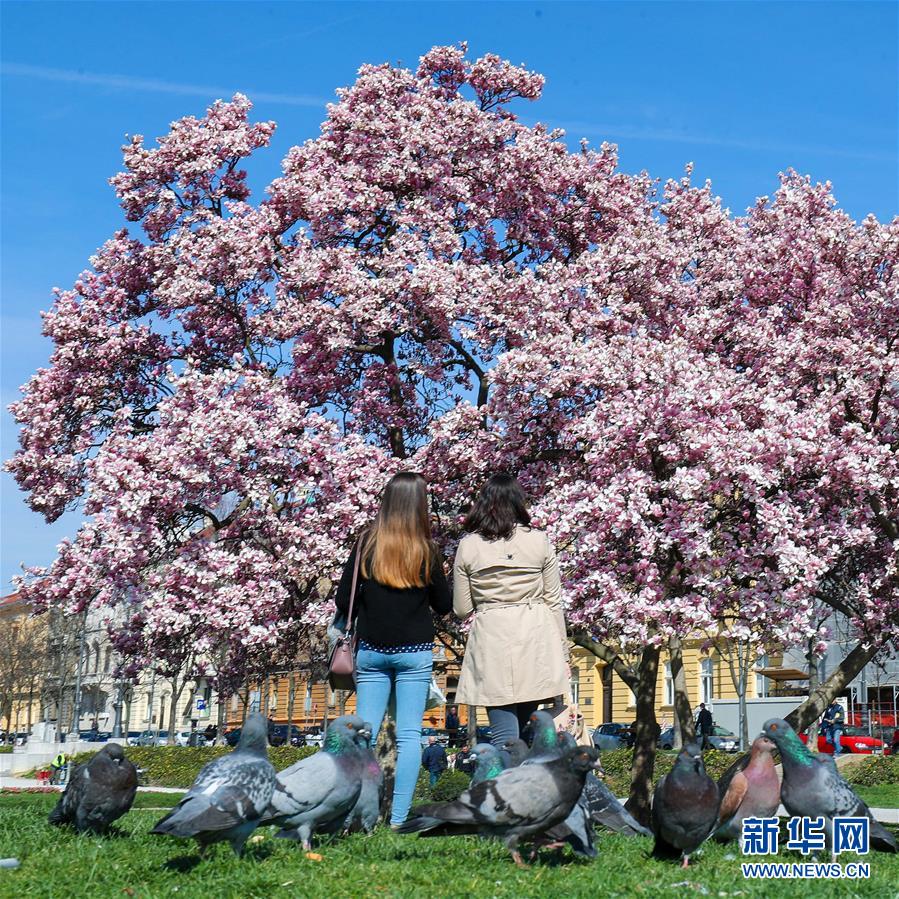 3月21日,游人在克罗地亚萨格勒布欣赏盛开的木兰花。 新华社发(萨宁摄)