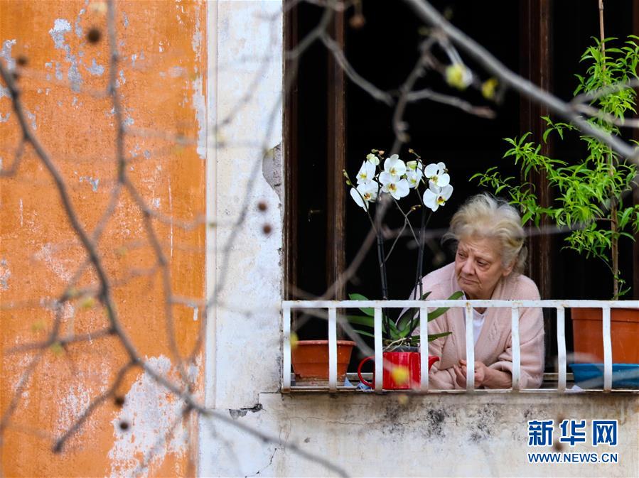 3月19日,在意大利首都罗马,一名老人倚在春色满溢的窗边。 新华社记者兰红光摄