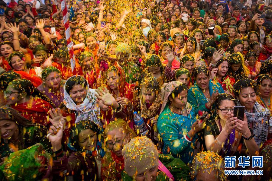 3月21日,在尼泊尔加德满都,人们欢庆百花节。 新华社发(苏拉韦尔·什雷斯塔摄)