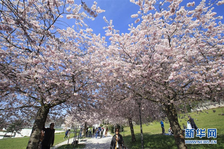 3月31日,游人在瑞士洛桑的一个公园观赏樱花。 新华社记者徐金泉摄