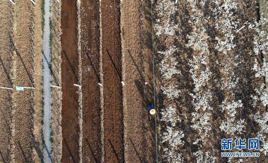 4月3日,山东省临沂市郯城县郯城街道前进村农民在田间忙碌(无人机拍摄)。新华社发(张春雷 摄)