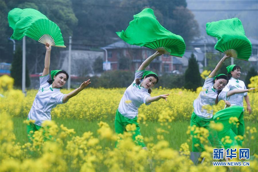4月4日,演员在万市镇的春季田园的舞台上为游客和当地百姓表演节目,“田园餐桌”活动就在五彩的田野中进行。新华社记者 徐昱 摄