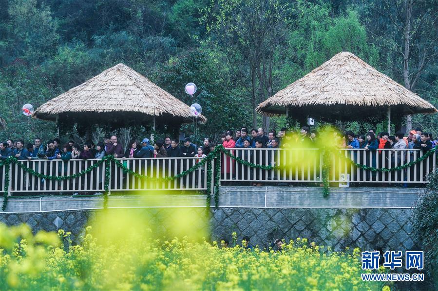 4月4日,游客和当地百姓在观看表演,“田园餐桌”活动就在五彩的田野中进行。华社记者 徐昱 摄
