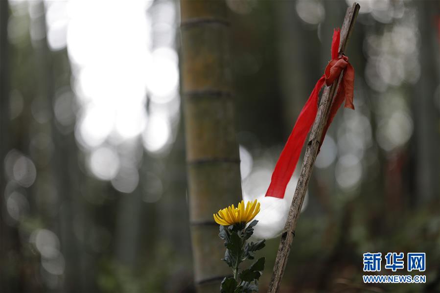 福建武夷山洋庄乡小浆村张山头红军墓冢上的编号和红飘带(3月25日摄)。新华社记者刘芳摄