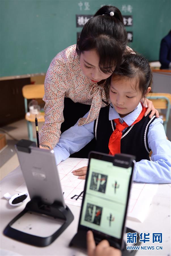 4月4日,昆明市盘龙小学语文教师武敏(左)指导四年级学生体验智能书法课。 新华社记者秦晴摄