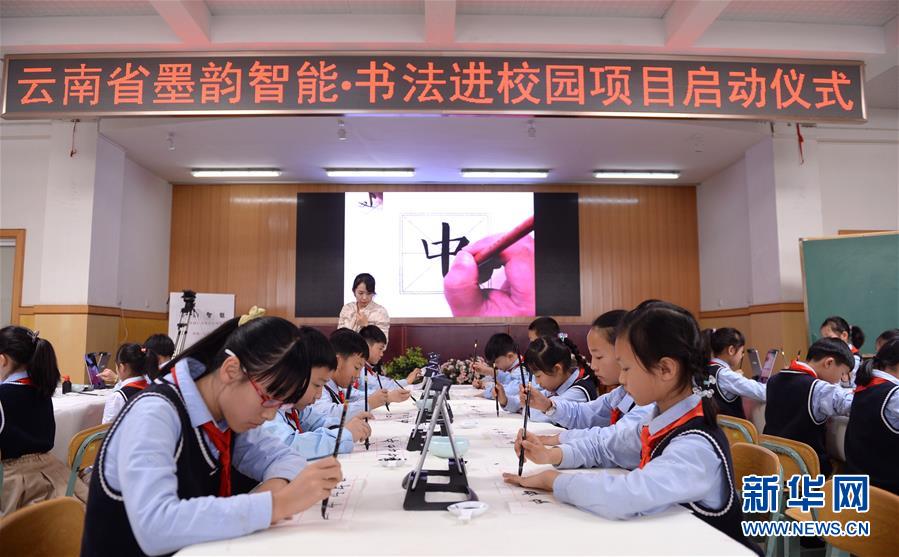 4月4日,昆明市盘龙小学的四年级学生在体验智能书法课。 新华社记者秦晴摄