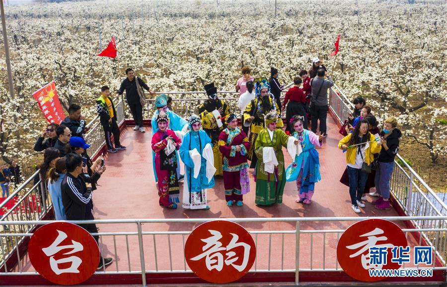 4月4日,戏曲票友在霞口镇刘老人村“百年梨园”的戏台上为游客表演评剧。 新华社记者 李晓果 摄