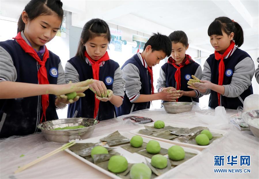 4月4日,江苏省苏州市东大街小学的学生在校园里学做青团。新华社发(杭兴微 摄)
