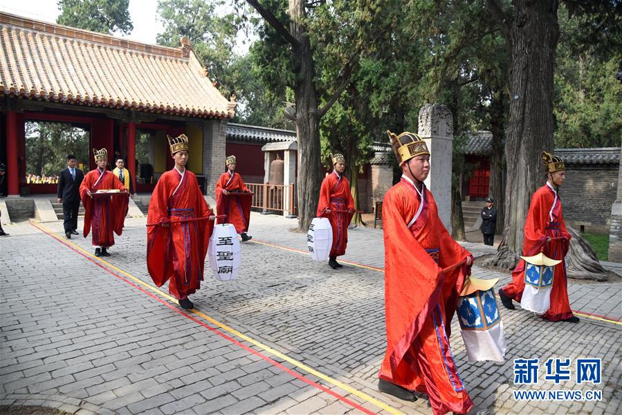 4月4日,司礼生引导主祭官走向尼山孔庙大成殿。 新华社记者 王凯 摄