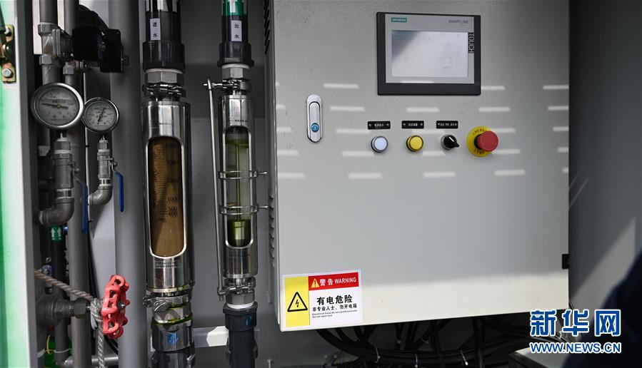 这是上海崇明区陈家镇花漂村一处生活污水处理点的生活污水处理设备,左侧可见处理前和处理后的水质对比(3月26日摄)。 新华社记者方喆摄