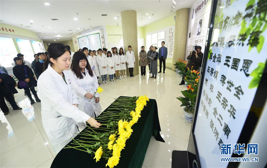 4月4日,在天津医科大学生命意义展厅,天津医科大学师生缅怀遗体捐献者。新华社发(史淞予 摄)