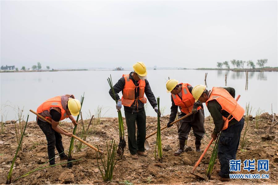 施工人员在杞麓湖边栽种水葱(4月3日摄)。新华社记者 胡超 摄