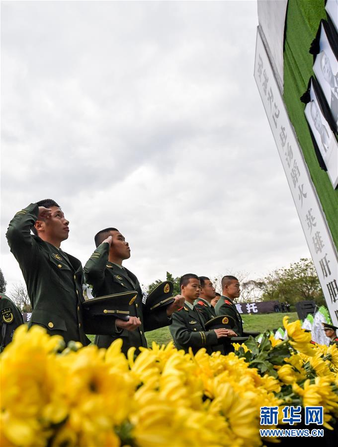 4月4日,参加四川木里森林火灾扑救中英勇牺牲烈士悼念活动的武警部队官兵向牺牲的战友敬礼。 当日,四川木里森林火灾扑救中英勇牺牲烈士悼念活动在西昌市举行。 新华社记者 张超群 摄