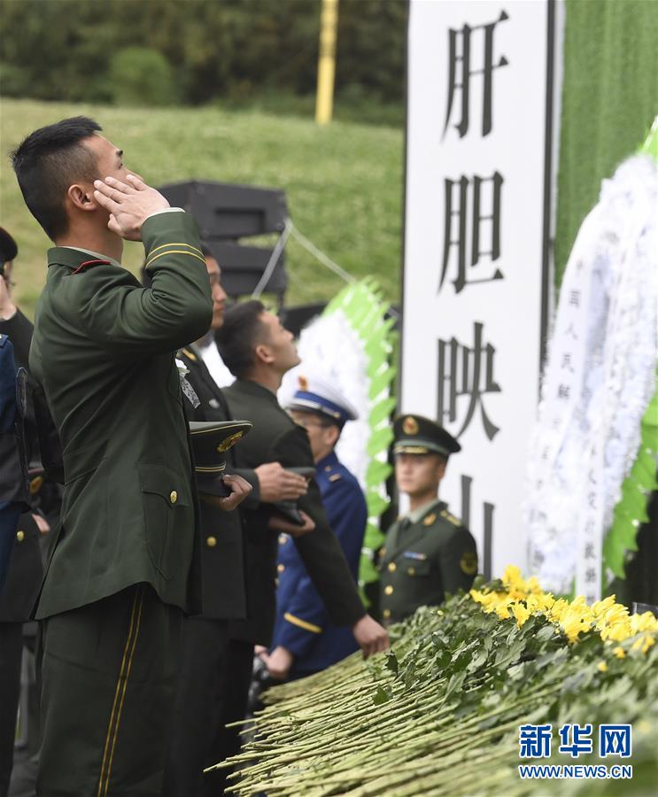 4月4日,一名战士向烈士遗像敬礼。 当日,四川木里森林火灾扑救中英勇牺牲烈士悼念活动在西昌市举行。 新华社记者 刘坤 摄