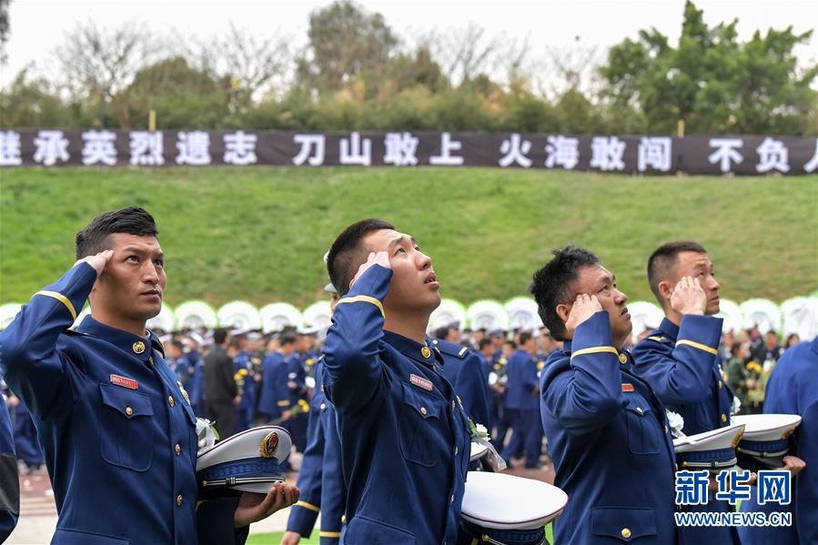 4月4日,参加四川木里森林火灾扑救中英勇牺牲烈士悼念活动的森林消防官兵向牺牲的战友敬礼。 当日,四川木里森林火灾扑救中英勇牺牲烈士悼念活动在西昌市举行。 新华社记者 张超群 摄