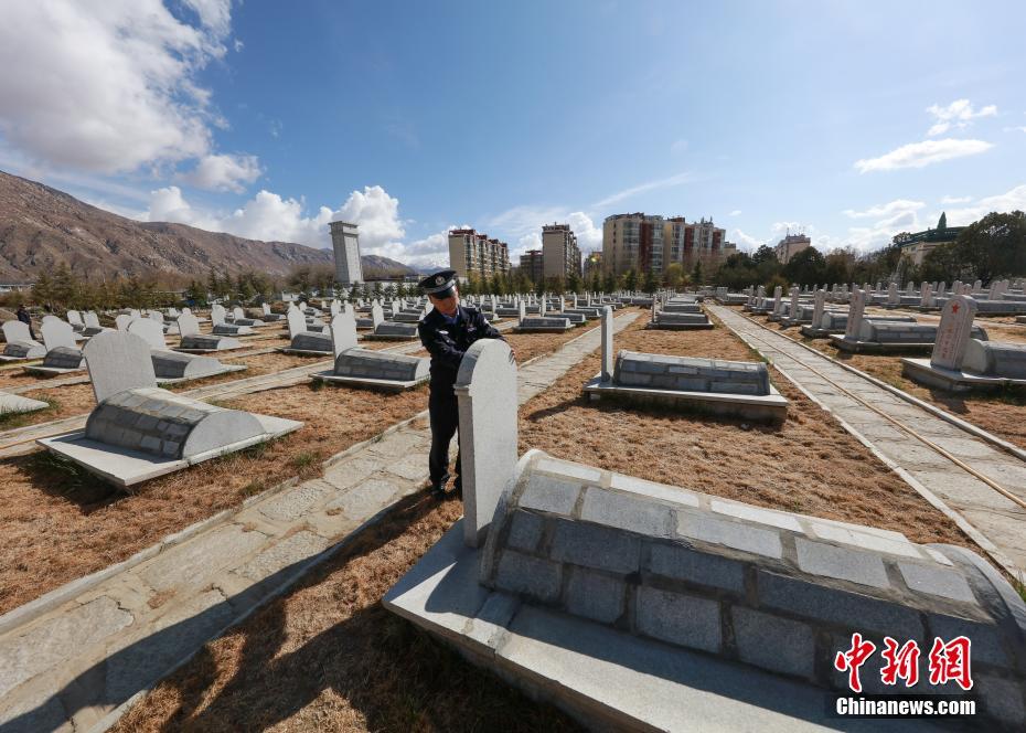近日,西藏出入境边防检查总站及其各单位以多种形式向革命先烈表达缅怀和哀思。活动当日,西藏出入境边防检查总站组织50余名民警前往拉萨市革命烈士陵园开展祭奠英烈活动。全体民警在革命烈士纪念碑前整齐列队、庄严肃立,怀着崇高的敬意,向为西藏和平解放与社会发展建设献身的烈士敬献花圈并脱帽默哀。图为民警陈永胜为无名烈士擦拭墓碑。何宇恒 摄