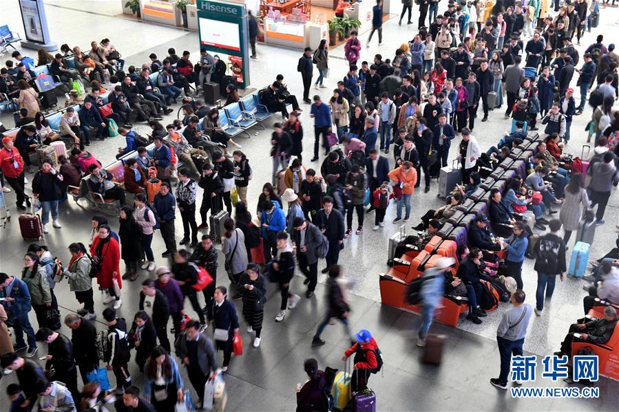 4月5日,在济南西站,旅客排队进站乘车。当日是清明假期第一天,山东济南迎来外出旅游、探亲的客流高峰。新华社记者 郭绪雷 摄