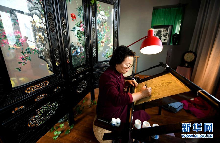4月4日,徐氏刺绣传承人刘玉霞在石家庄市桥西区的工作室内进行刺绣创作。徐氏刺绣2018年被列入石家庄市第七批非物质文化遗产名录。其传承人刘玉霞自幼随母学习刺绣技法,经过多年学习研究,刘玉霞在保留中国传统刺绣工艺的基础上,将西洋画、中国水墨画、摄影等艺术元素融入其中,形成独特的刺绣风格。新华社发(陈其保 摄)