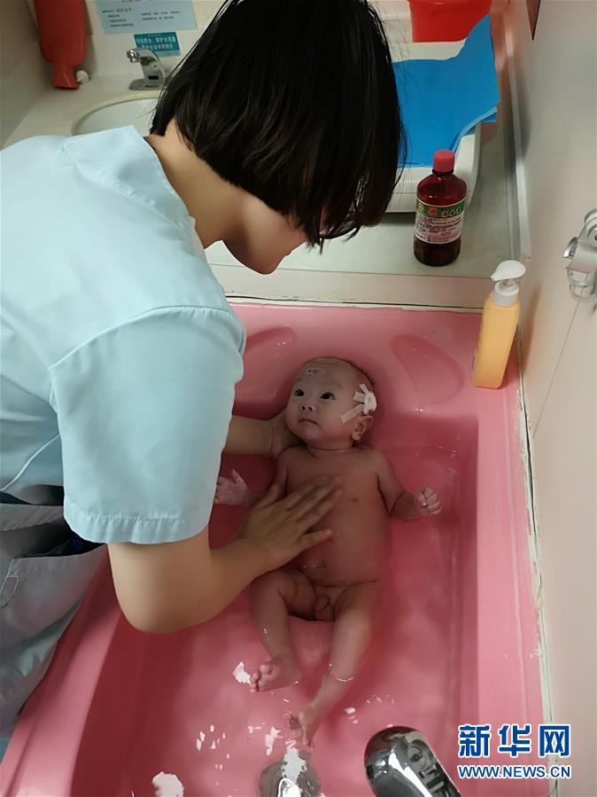 湖南省人民医院新生儿科护士在给宏二洗澡(资料照片)。新华社发(湖南省人民医院提供)