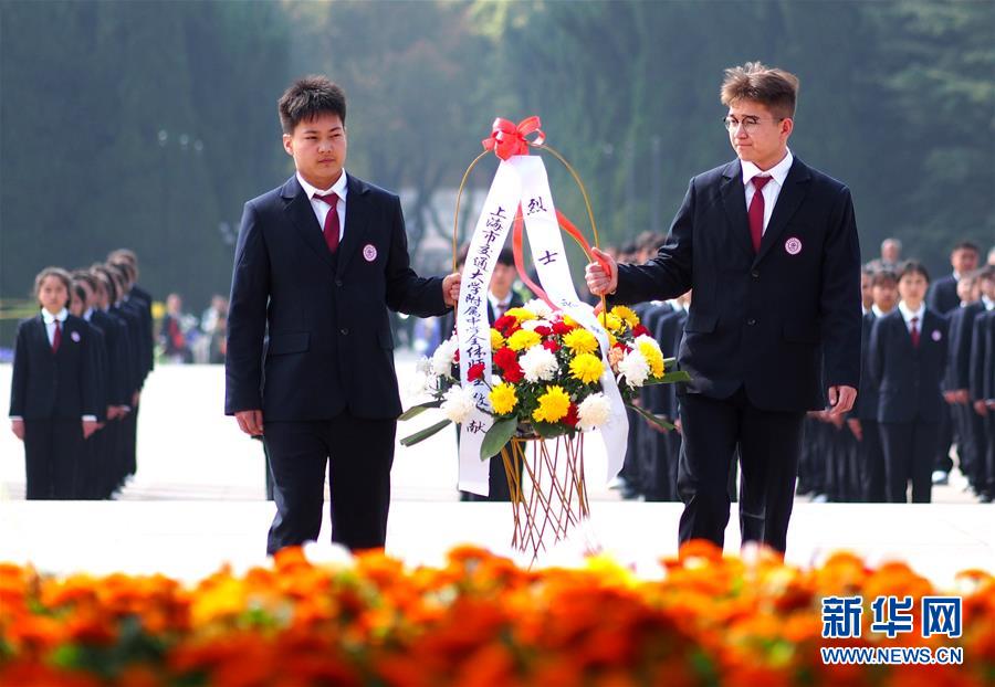 4月5日,一些中学生在上海龙华烈士陵园的英雄纪念碑前敬献花篮。当日是清明节,许多上海市民自发前往全市各处烈士纪念设施,敬献鲜花、为烈士擦拭墓碑,表达对英烈的敬意。 新华社记者 陈飞 摄