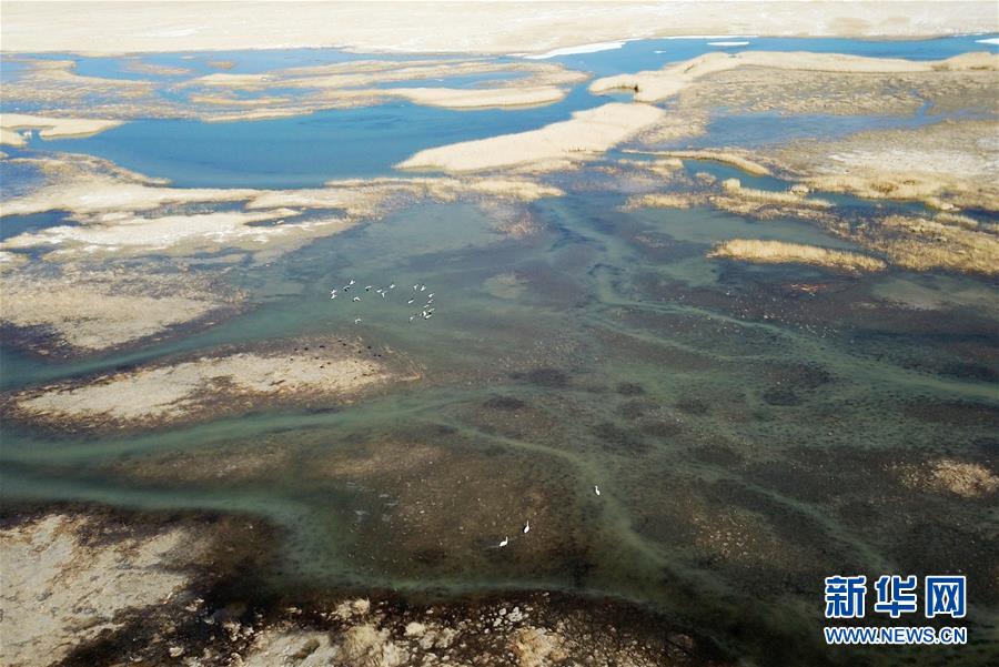 候鸟在小苏干湖湿地上空飞翔(4月5日无人机拍摄)。 近日,随着气温回升,甘肃省酒泉市阿克塞哈萨克族自治县境内的大苏干湖、小苏干湖湿地冰雪消融,迎来了陆续北归的白天鹅、黑颈鹤、斑头雁等大批候鸟,为春天的高原湿地增添了一道靓丽风景。 新华社记者 陈斌 摄
