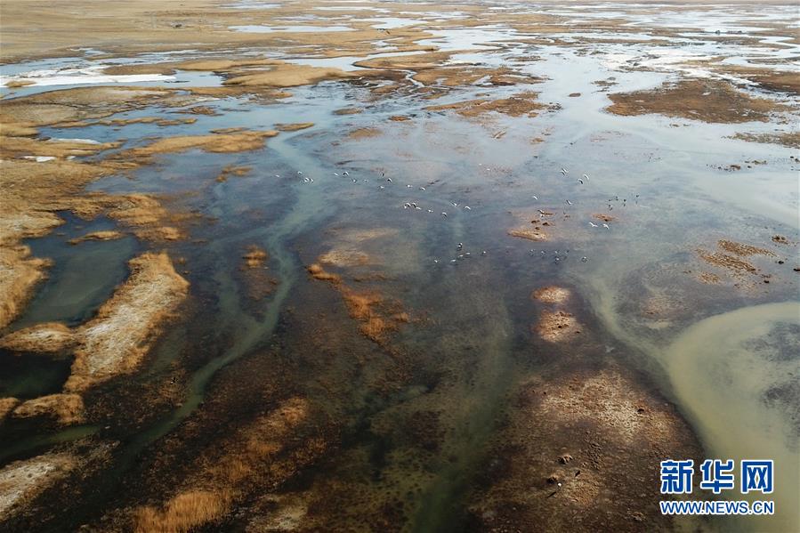 候鸟在小苏干湖湿地上空飞翔(4月5日无人机拍摄)。 近日,随着气温回升,甘肃省酒泉市阿克塞哈萨克族自治县境内的大苏干湖、小苏干湖湿地冰雪消融,迎来了陆续北归的白天鹅、黑颈鹤、斑头雁等大批候鸟,为春天的高原湿地增添了一道靓丽风景。 新华社记者 陈斌 摄