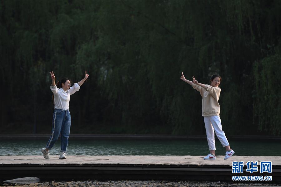 4月5日,游人在合肥市天鹅湖畔留影。清明时节,合肥市天气晴好,众多市民和游人到户外享受假日时光。 新华社记者张端摄