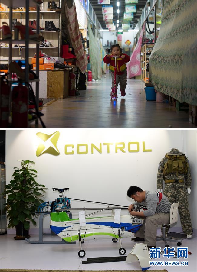 拼版照片:上图为一名小朋友在地处北京动物园附近的空荡的天皓成服装批发市场玩耍(2015年1月12日摄);下图为一家无人机开发企业的工作人员在由天皓成服装批发市场转型的宝蓝金融创新中心工作(2018年4月3日摄)。 新华社记者 罗晓光 摄