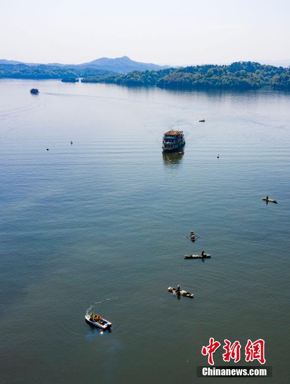 2019年4月7日,游客乘船在江西省新余市仙女湖国家风景名胜区饱览湖光山色,“围观”渔民水上春管景观。清明小长假最后一天,来自全国各地的游客在仙女湖畅游山水,踏青赏玩,尽享假日好时光。王剑/文 赵春亮/摄