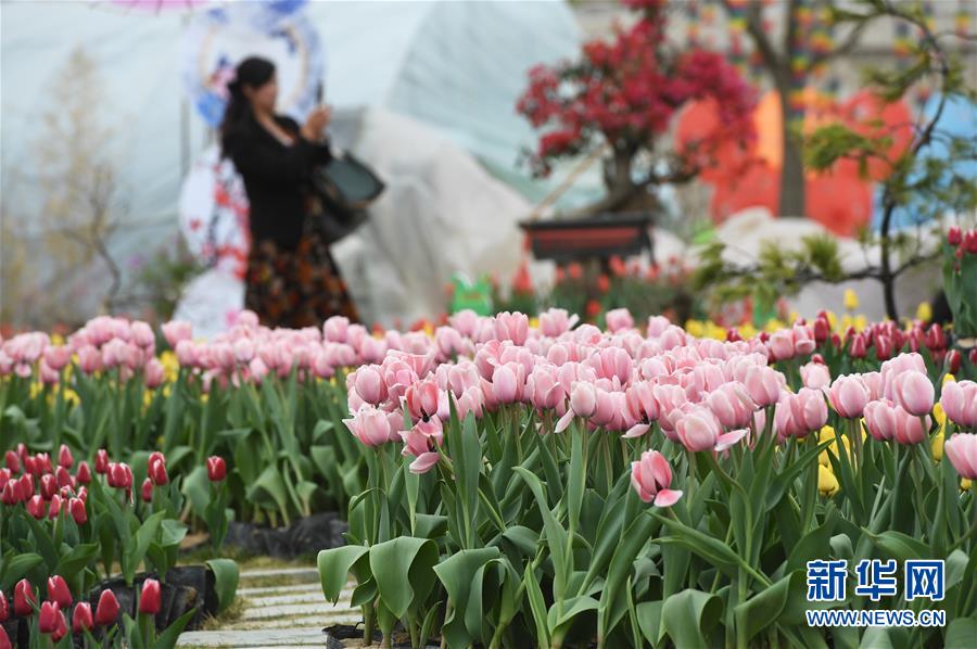 4月8日,在榆中县李家庄田园综合体内,游客在郁金香花丛中拍照留念。新华社记者范培珅摄