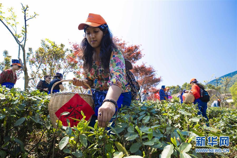 4月8日,留学生在体验采茶。当日,位于江西庐山市的忆恋生态园迎来50位外国留学生,留学生们通过采茶、观摩制茶,体验庐山传统茶文化。新华社发(韩俊烜 摄)
