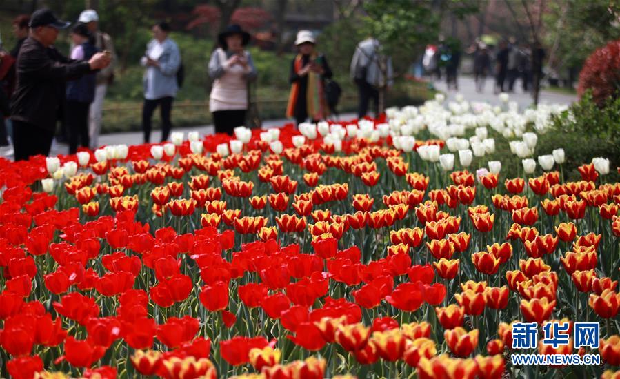 4月8日,游客在扬州瘦西湖万花园观赏盛开的郁金香。当日,2019瘦西湖万花会在江苏扬州瘦西湖万花园开幕,20余万株花卉争奇斗艳,吸引市民和游客前来观赏。新华社发(孟德龙 摄)