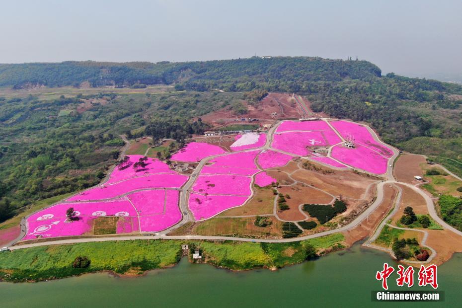 4月8日,航拍江苏句容天王花果原乡芝樱小镇内三百亩芝樱花绚丽绽放,“粉色花毯”漫山遍野,吸引了大批市民和游客前来观赏,感受别样的浪漫情怀。 中新社记者 泱波 摄