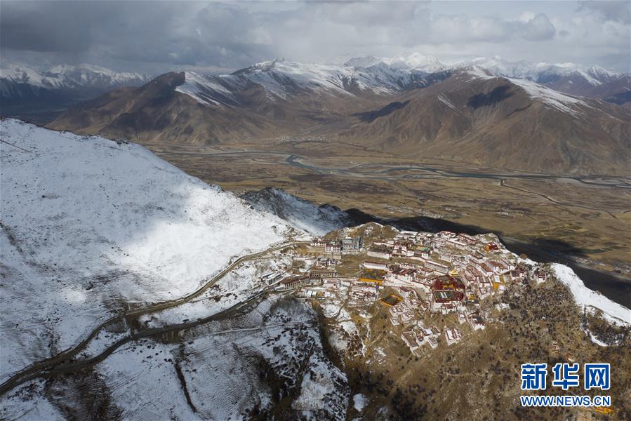 雪后的甘丹寺(4月8日无人机拍摄)。新华社记者普布扎西摄
