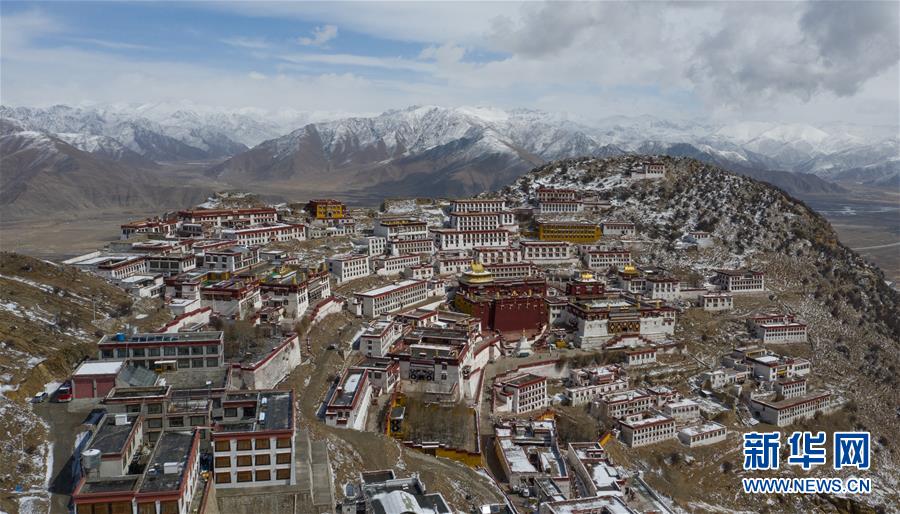 雪后的甘丹寺(4月8日无人机拍摄)。新华社记者普布扎西摄