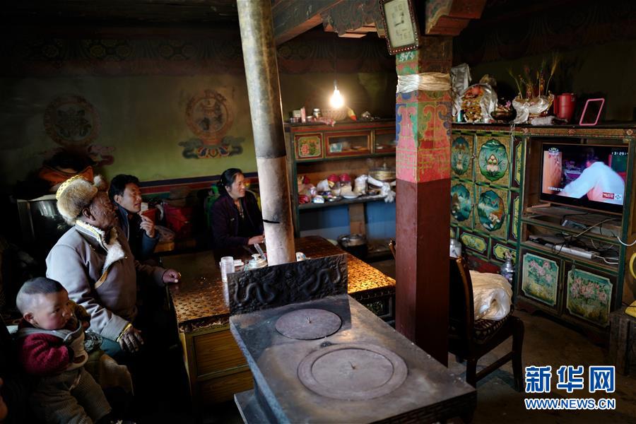 拉旺的长子旦增群培和家人一起看电视(3月17日摄)。 新华社记者李鑫摄