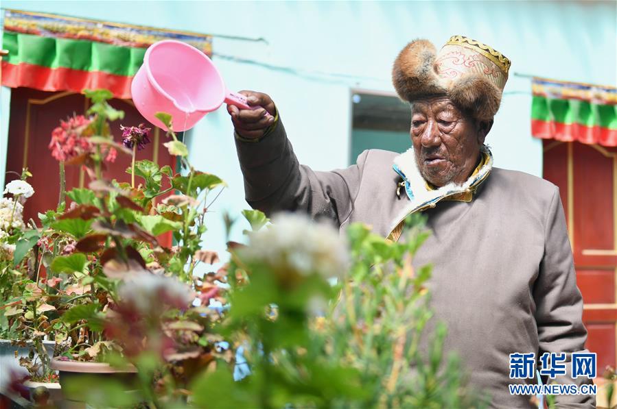 拉旺的长子旦增群培在家里浇花(3月17日摄)。 新华社记者晋美多吉摄