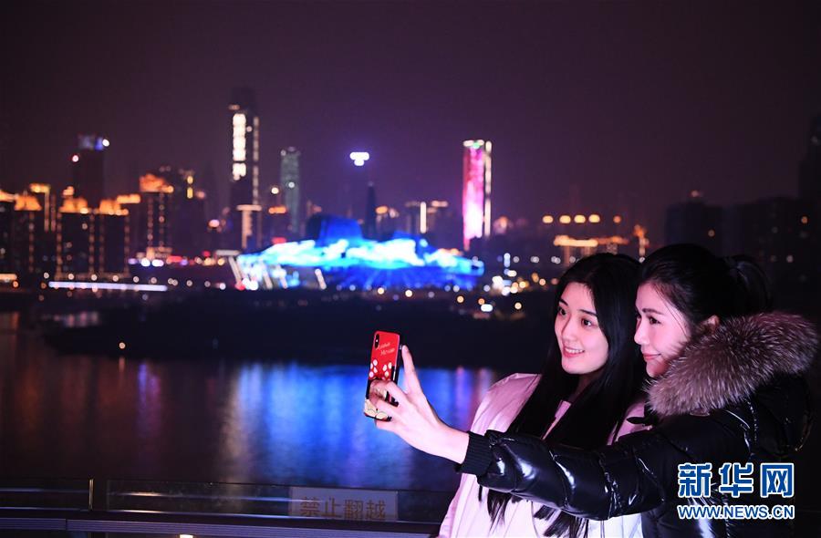 游客在重庆市南岸区街头合影留念(1月1日摄)。 千里为重,广大为庆。城在山水间、山水在城中,重庆颇具特色的立体城市景观是城市靓丽的名片。 新华社记者 王全超 摄