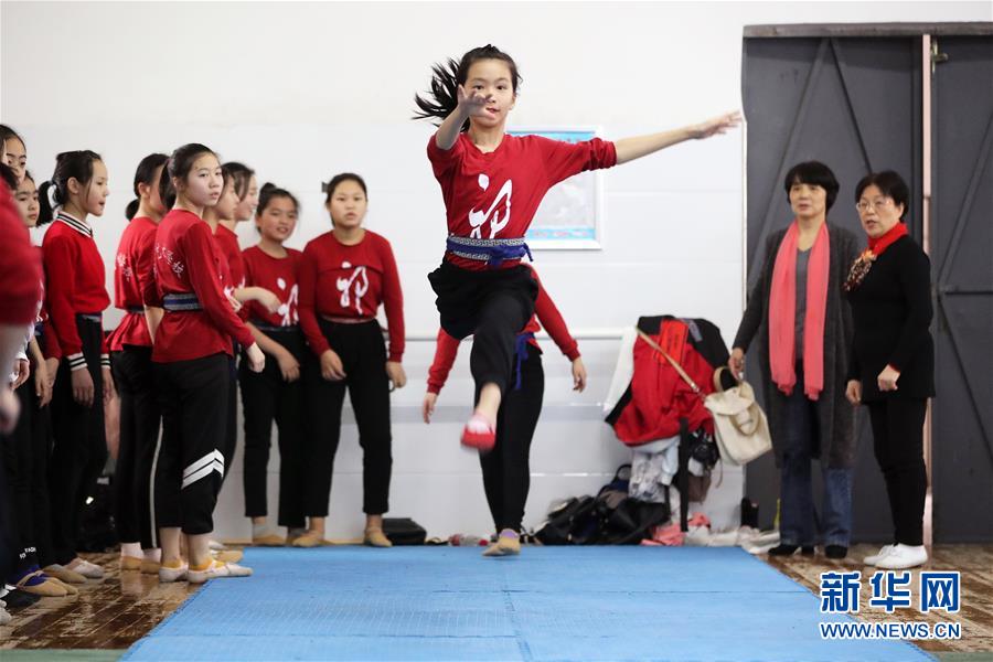 4月10日,在湖南省衡阳市艺术学校的练功房里,祁剧班的孩子在练习腾空一字前跃。 该祁剧班一共有40名学员,最小的10岁、最大的14岁,他们在这里经过6年的学习和训练后才能登台表演。祁剧是湖南传统地方戏剧种之一,于2008年入选第二批国家级非物质文化遗产名录。 新华社发(罗盟 摄)