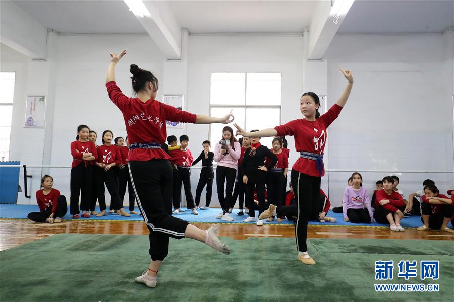 4月10日,在湖南省衡阳市艺术学校的练功房里,祁剧班的孩子在练习基本功。 该祁剧班一共有40名学员,最小的10岁、最大的14岁,他们在这里经过6年的学习和训练后才能登台表演。祁剧是湖南传统地方戏剧种之一,于2008年入选第二批国家级非物质文化遗产名录。 新华社发(罗盟 摄)