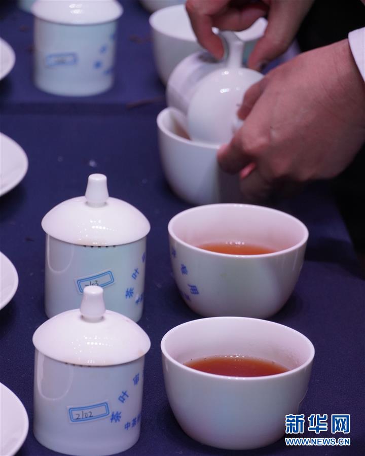 4月10日,茶叶评委在现场对参赛茶叶的汤色进行评判。 当日,中国(广西)六堡茶斗茶大会在南宁举行,来自广西各地的180多个六堡茶样品参加比赛,现场就茶叶的形状、紧松度、色泽、净度、汤色、香气、滋味、叶底八个方面进行比拼。 新华社发(喻湘泉 摄)