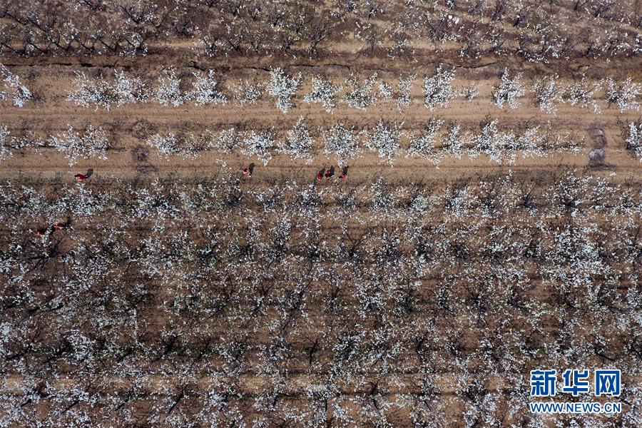 4月10日,游人在山西省祁县古县镇闫漫村赏花(无人机拍摄)。随着天气回暖,山西省祁县15.7万亩梨花陆续绽放,当地果农忙碌着为梨花授粉,不少游客也前来踏青赏花。 新华社记者 詹彦 摄