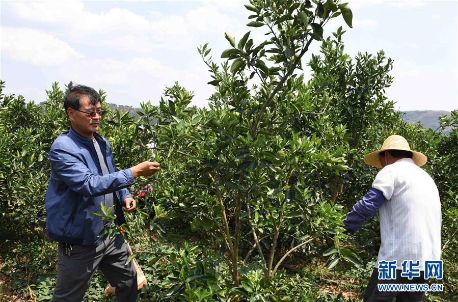 4月8日,在云南弥勒朋普镇可乐村的荒山上,工人在修剪柑橘树枝叶。新华社记者杨宗友摄