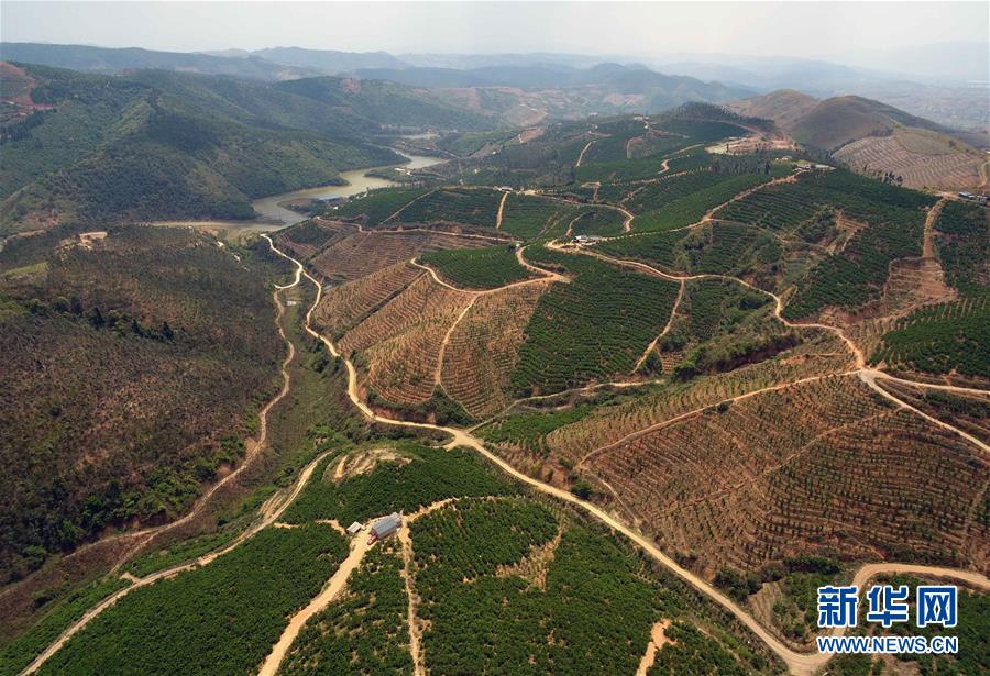这是4月8日无人机拍摄的云南弥勒朋普镇可乐村荒山上的果园。新华社记者杨宗友摄