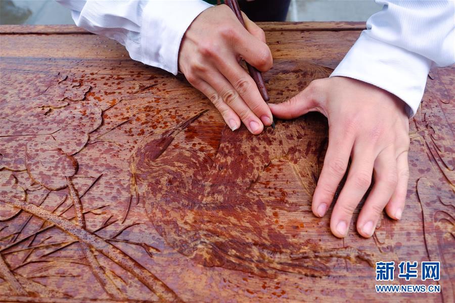 4月11日,雕刻工在现场展示红木加工中的雕刻技艺。当日,被誉为“红木第一村”的浙江省东阳市南马镇花园村进行一场由3000多名工匠参加的“工匠大会”,现场展示红木加工过程中的卯榫拼接、刮磨、雕刻等工艺,展现当地红木产业发展过程中培养的大批专业工匠的精湛技艺,倡导工匠精神。 新华社记者 徐昱 摄