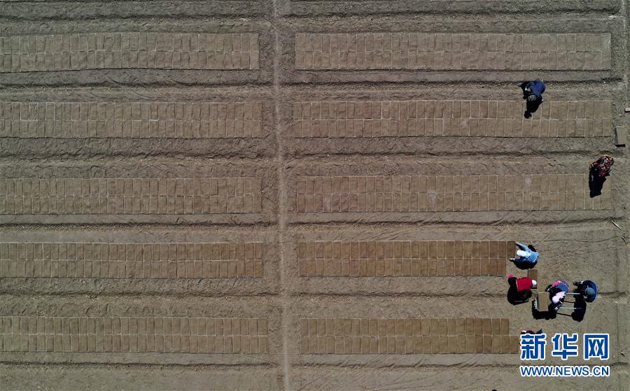 4月11日,唐山市海港经济开发区王滩镇安家海村的农民在稻田地里码放稻谷秧盘(无人机拍摄)。 暮春时节,河北省唐山市水稻种植区的农民抢抓农时灌田、育秧,田间地头呈现一派繁忙的景象。 新华社记者 杨世尧 摄