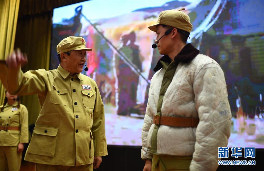 青海省海西蒙古族藏族自治州委党校高级教师白继红(前左)在青海西宁举行的“慕生忠开路精神”党课上扮演慕生忠将军(3月20日摄)。 新华社记者 张宏祥 摄