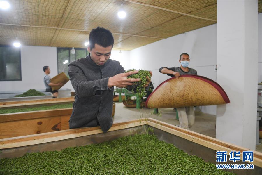 4月10日,在福建省武夷山国家级自然保护区桐木村起源茶厂,制茶师肖和文(前)对正在萎凋的金骏眉进行翻青。 新华社记者 宋为伟 摄